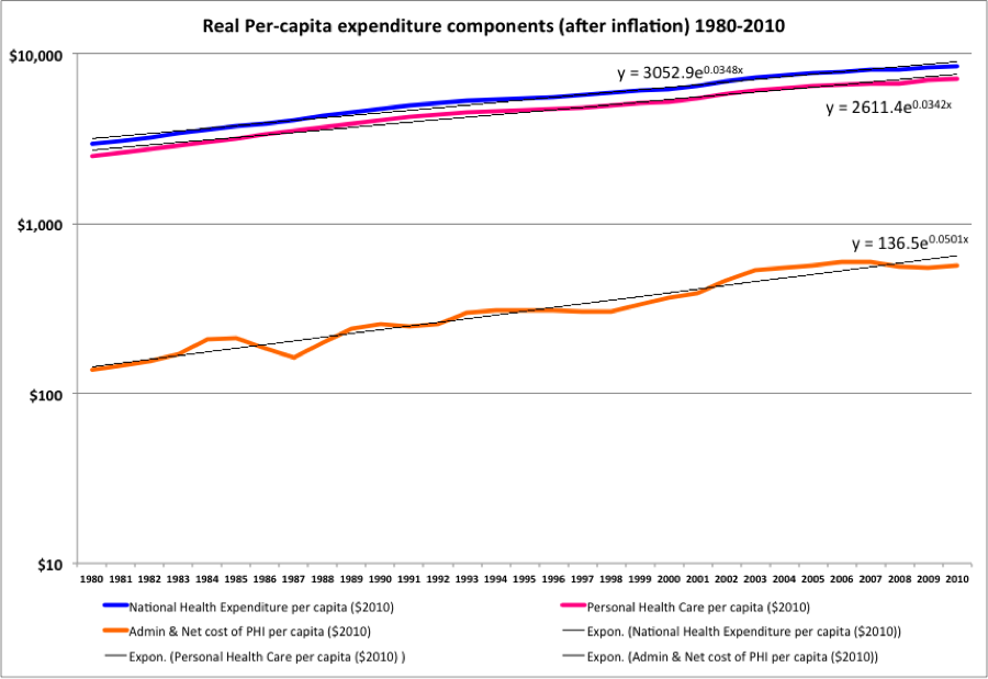 To tie this discussion back to the prior posts on this topic, the graph below shows Total National Health Expenditures and both the Personal Health Care Component and the Administrative Component (all per capita and in $2010). It clearly shows the similar growth rates of both total NHE and of Personal Healthcare Expenditures (3.5% per annum from 1980 -2010) and the somewhat faster growth rate of the Administrative cost component (5% over the same 1980-2010 period).