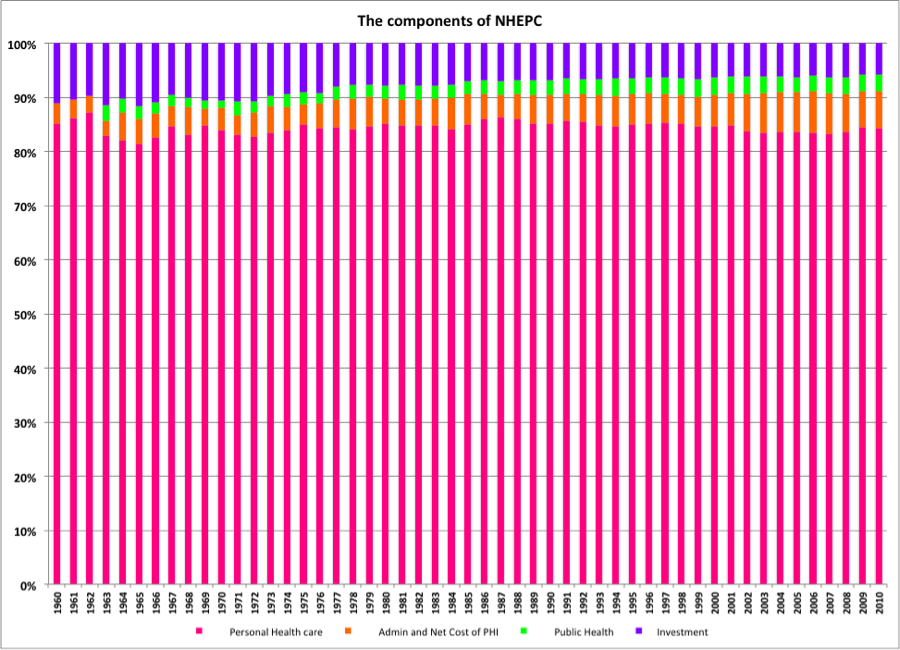 But, take a look at the purple bars in the chart, which show the portion of healthcare expenditure allocated to “Investment”. It has been declining steadily since the early ’70’s, being replaced in part by some increases in the bucket called “Public Health” (green) but primarily as a result of the growth of the bucket called “Admin and net cost of PHI” (orange). Note that this is not just a growth in absolute terms. This is a systematic growth in the fraction of healthcare expenditures allocated to this “Admin” bucket.