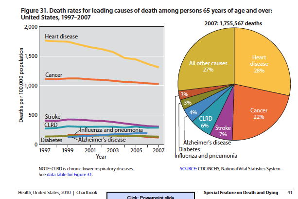 Unsurprisingly, heart disease, cancer, and trauma are the three biggest ticket items. I found some of the other big categories a bit surprising. Food for thought.