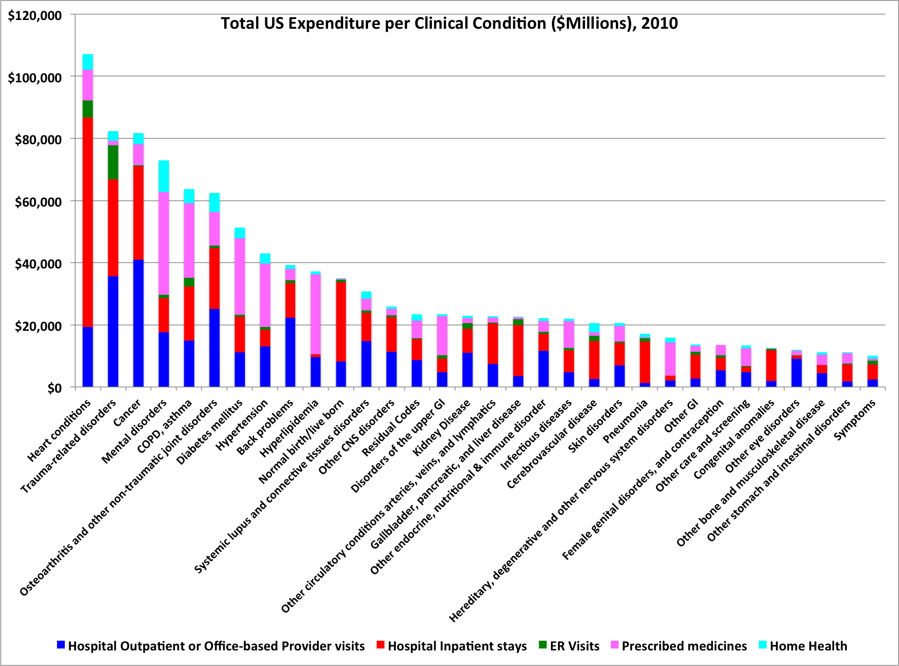 There has been a lot written recently about how some diseases cost the healthcare system more than others, and the fact that some patients (the sick ones and the old ones) cost more than others. I wanted to learn more about which clinical conditions are the big contributors to our national healthcare bill. So, for the purposes of this post I pretended I was an accountant, responsible for thinking about where to save money in the USA’s health budget. Here is what I learned.