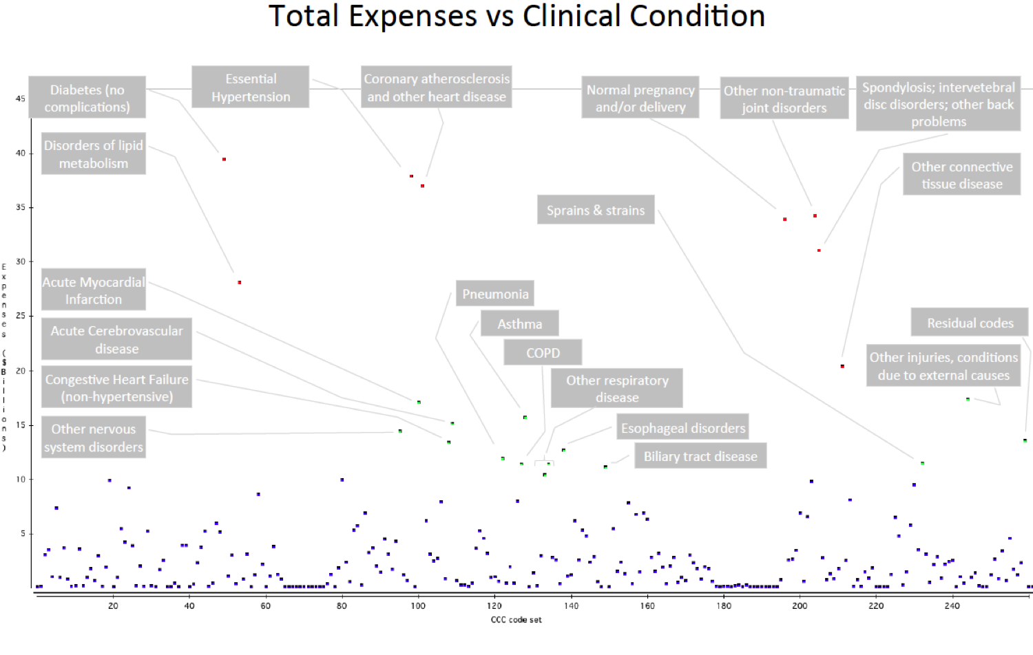The 8 red dots represent clinical condition codes with annual expenditures each in excess of $20 Billion. The green dots represent 14 clinical condition codes with costs in excess of $10 Billion (but less than $20B).